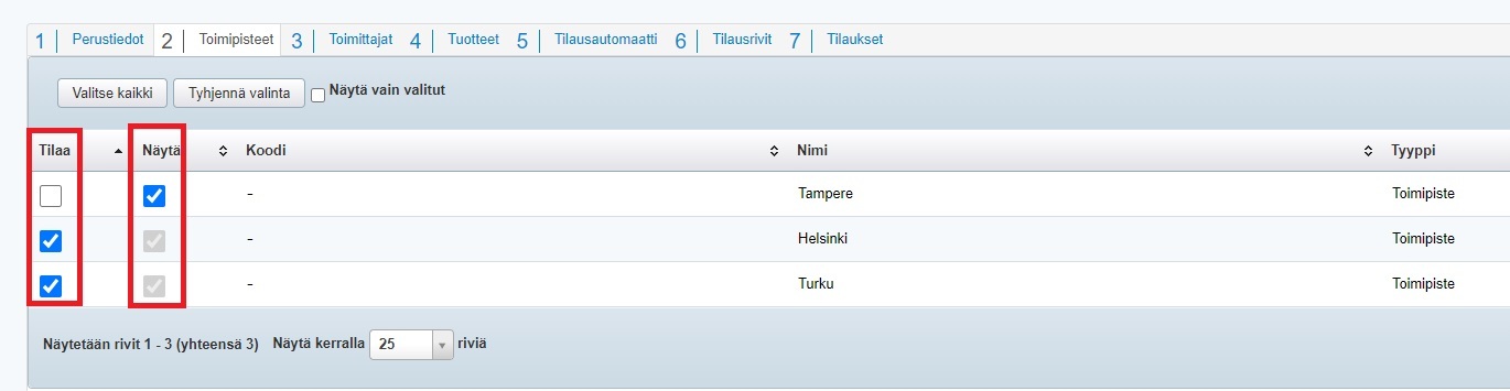 - Siirry kohtaan Toimipisteet. Valitse toimipisteet, joihin haluat tilata tuotteita. Voit myös valita, että toimipisteen tilanne näytetään tilausta tehtäessä, mutta siihen ei voi tilata tuotteita: