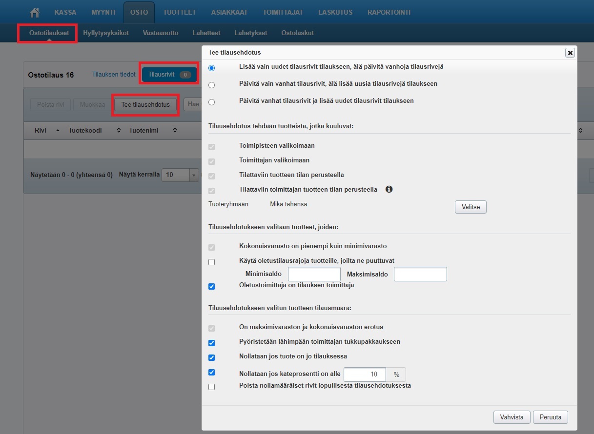 - Voit myös valita, poistetaanko nollamääräiset rivit tilausehdotuksesta. Jos rivejä ei poisteta, voit tarpeen tullen lisätä myös nollariveille muutaman tuotteen ja poistaa sitten manuaalisesti ne rivit, joita ei omankaan arviosi mukaan tarvitse tilata.