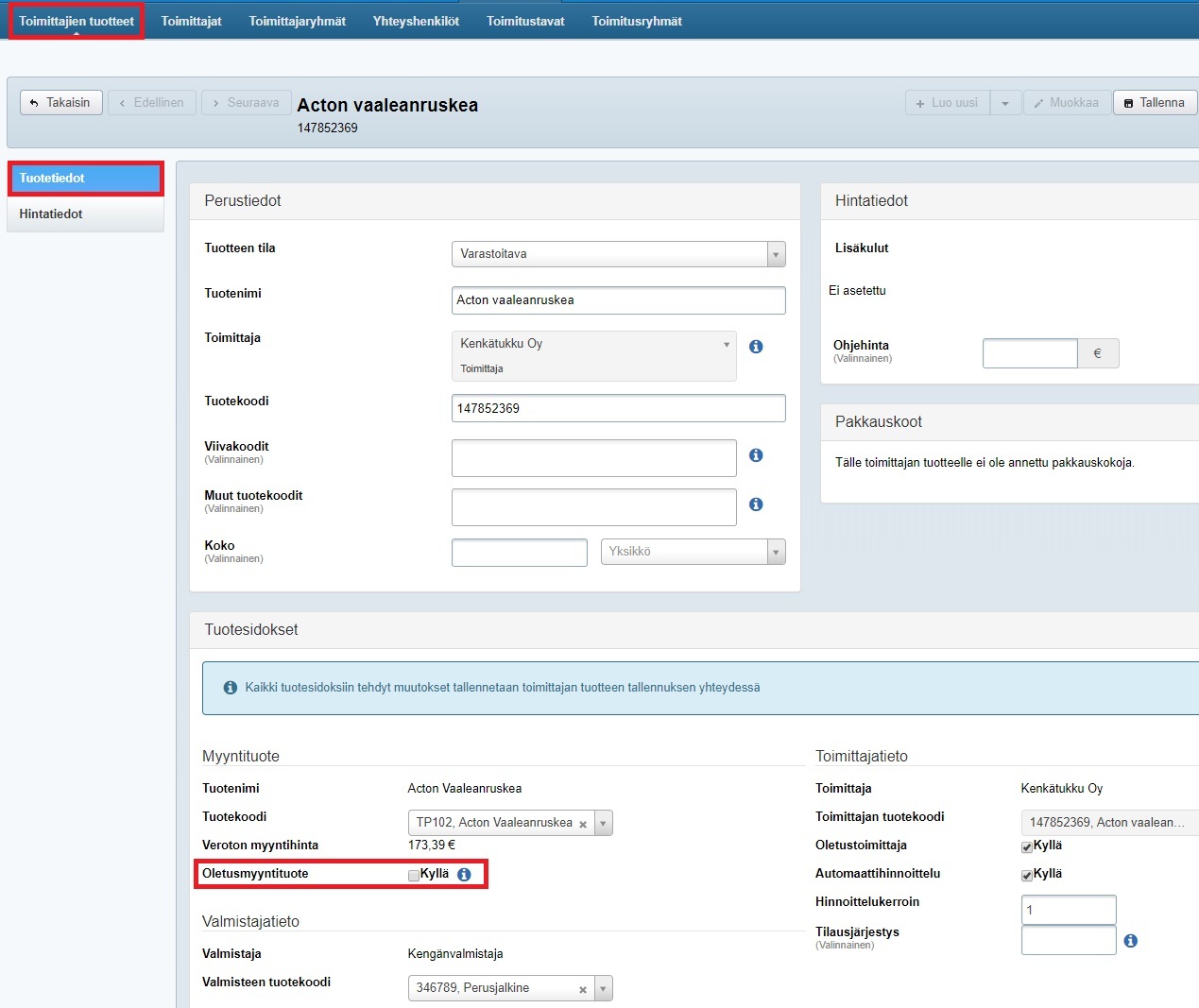 Samassa kohdassa voit lisätä tuotteelle sidoksen myös valmistajan tuotetietoihin. Lisätietoa tuotesidoksista. - Lisätiedot-osion kuvaus näytetään vain toimittajan tuotteen tietokortilla. Huomiota ei tällä hetkellä näytetä, kun tuote valitaan esim. ostotilaukseen, eikä se tulostu tositteille.
