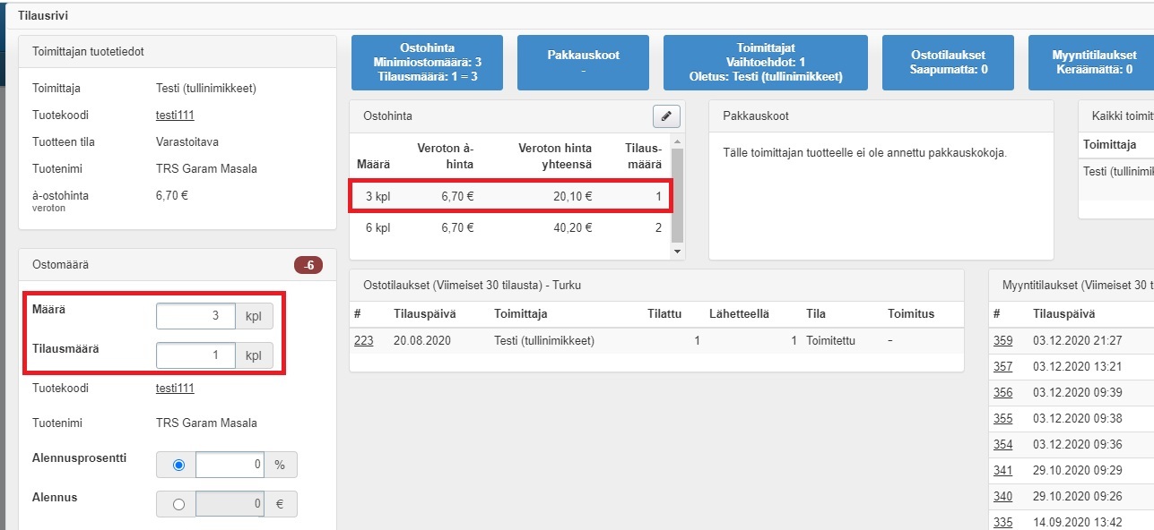 - Kun näin hinnoiteltua toimittajan tuotetta tilataan, tilausmääräksi syötetään ostotilauksella 1 kpl, jolloin määrä on automaattisesti 3 kpl (eli tässä tapauksessa kiloa):