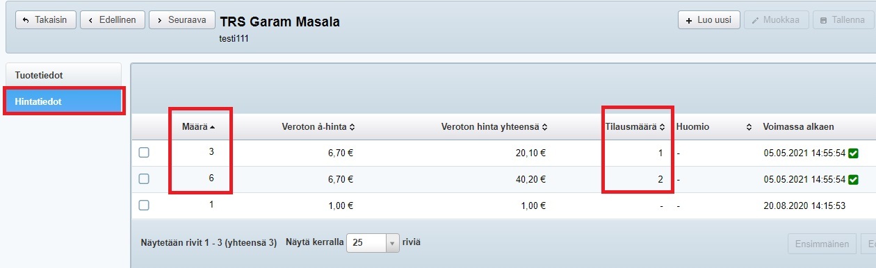 Huom! Muista, että kun asetat toimittajan tuotteelle hintaa, on hinta aina Määrä-kentän tuotemäärän hinta. Tilausmäärän mukaan hintaa ei voida asettaa.