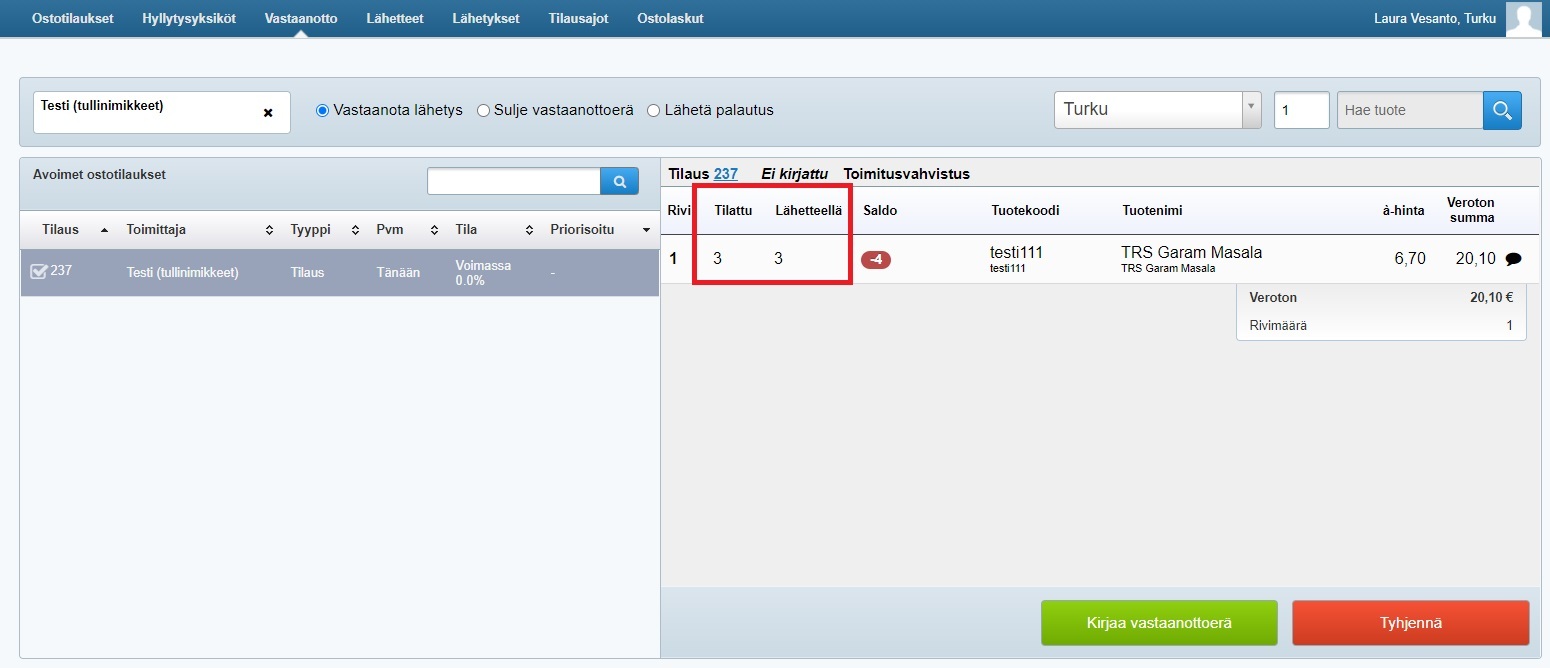 - Kun tilaus saapuu ja se kirjataan Tehdeniin, varastosaldoon otetaan automaattisesti 3 kappaletta (eli tässä tapauksessa kiloa):