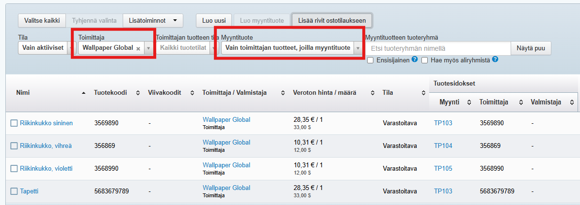 Toimittajien tuotteet -taulukossa ovat kaikki järjestelmään tallennetut toimittajien tuotteet. Voit suodattaa näkymää valitsemalla vain yhden toimittajan tuotteet tai tietyssä tilassa (esim. tilattavissa) olevat tuotteet. Voit käyttää tuotteen hakemiseen myös oikean ylänurkan hakukenttää. Tuotelistan voi tallentaa laskentataulukkona. Voit myös luoda toimittajan tuotteelle myyntituotteen suoraan tästä näkymästä Luo myyntituote -painikkeella.