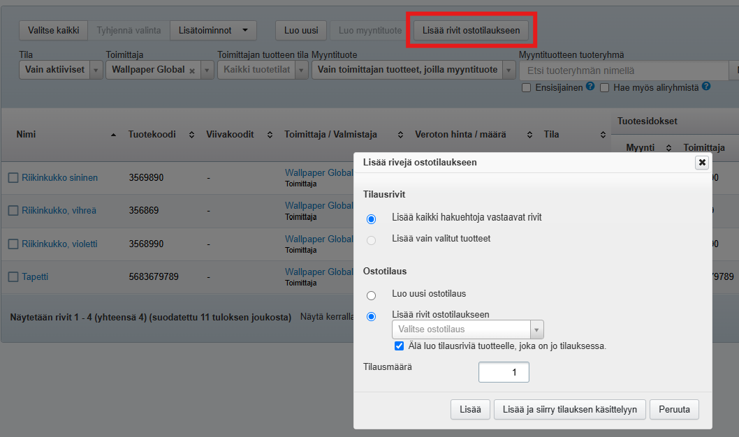 - Avautuvassa näkymässä pääset valitsemaan, luodaanko tuotteille uusi ostotilaus vai lisätäänkö tuoterivit olemassa olevalle ostotilaukselle. Jos tuote löytyy jo ostotilaukselta, se voidaan jättää lisäämättä. Voit myös määritellä, montako kappaletta tuotteita tilaukselle lisätään:
