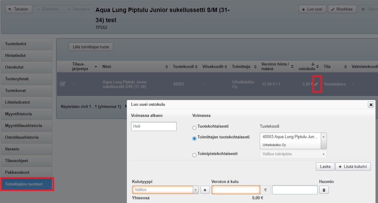 Tuotesidos-sarakkeen tuotekoodia klikkaamalla pääset toimittajan tuotetta vastaavan oman yrityksen tuotteen tai valmistajan tuotteen tietoihin. Myyntituotteen tuotekortin Toimittajan tuotteet -välilehden á ostokulu-sarakkeessa näytetään tuotteelle luodut ostokulut, ja kynän kuvaa klikkaamalla pääset luomaan tuotteelle uuden ostokulun: