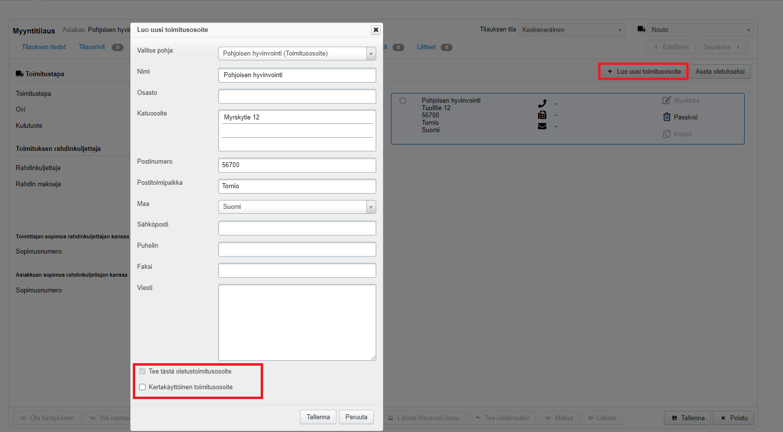 - Kun luot uuden toimitusosoitteen, sekä Tee tästä oletustoimitusosoite- että Kertakäyttöinen toimitusosoite -valinnat ovat oletuksena valittuina. Jos osoitetta on tarkoitus käyttää useamminkin, poista valinta kertakäyttöisyyskohdasta. Suosittelemme tätä toimintatapaa.