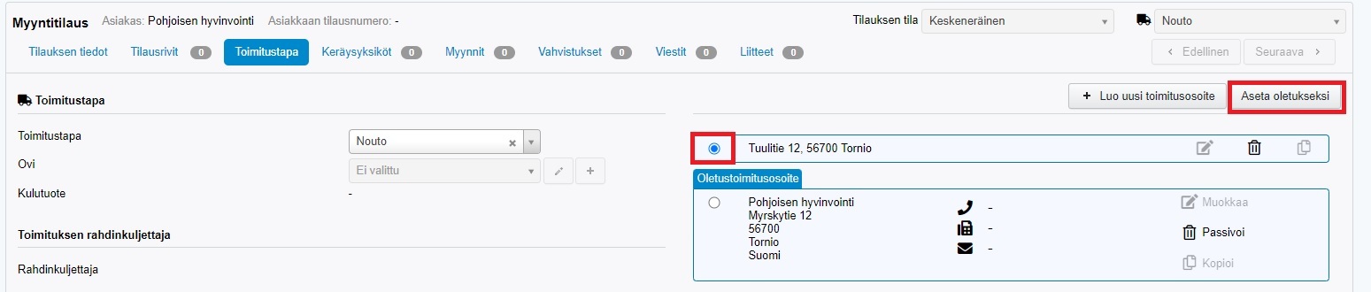 - Nyt asiakkaan toimitusosoite on tallennettu oletustoimitusosoitteeksi ja on automaattisesti valittuna tulevien myyntitilausten Toimitustapa-välilehdellä:
