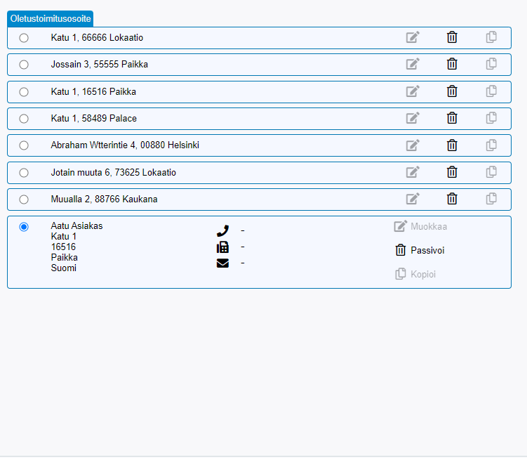 - Näet täällä kaikki asiakkaan tietoihin lisätyt toimitusosoitteet. Asiakaskortilta tulevaa osoitetta ei kuitenkaan voi muokata ja siten lisätä oletustoimitusosoitteeksi. Napsauta siis Luo uusi toimitusosoite -painiketta: