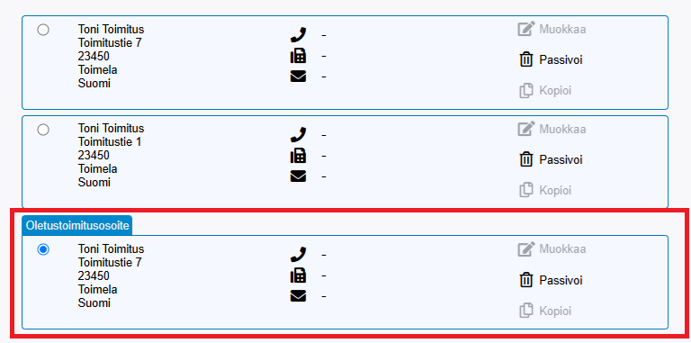 - Uuden toimitusosoitteen Tee tästä oletustoimitusosoite -valintaa ei voi tässä kohtaa poistaa, eli uudesta osoitteesta tulee aina ensin oletusosoite. Kun olet tallentanut osoitteen, voit muuttaa oletusvalintaa, eli valita oikean osoitteen ja sitten Aseta oletukseksi -painikkeen. Osoitteiden järjestystä voi myös muuttaa raahaamalla, jolloin ylimmäksi raahattu osoite asettuu oletusosoitteeksi.