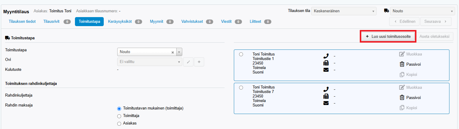 - Huomioi, että myyntitilauksen toimitustavoissa lisätyt osoitteet eivät siirry asiakkaan asiakaskortille.