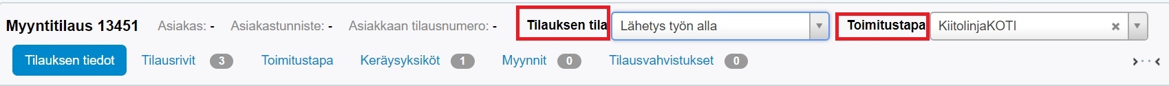 - Luo uusi myyntitilaus, hae asiakas myyntitilaukselle ja siirry Toimitustapa-välilehdelle.