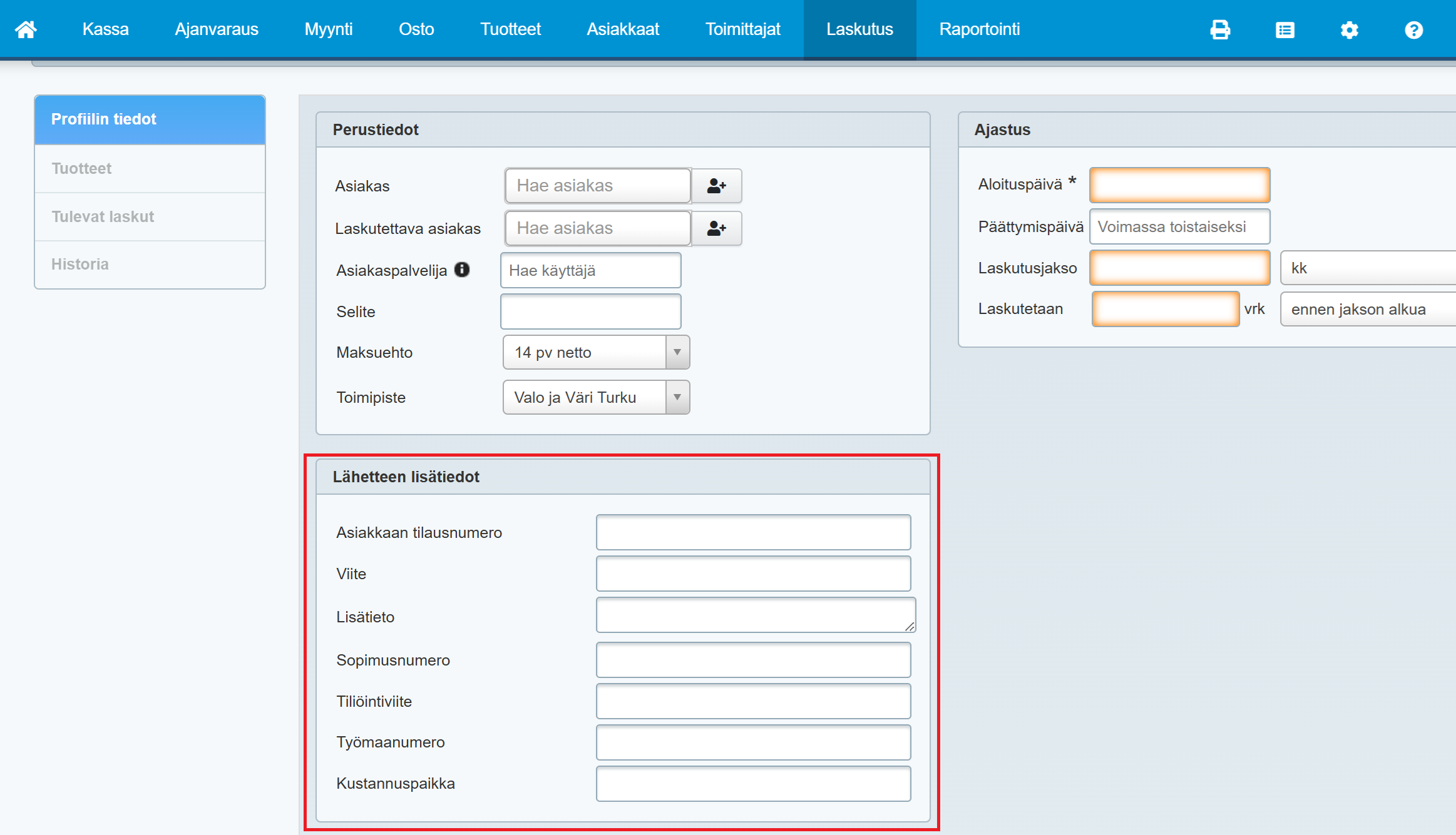 - Jos toistuvaan laskutukseen liittyy lisätietoja, jotka halutaan aina laskulle näkyviin, voidaan ne lisätä Lähetteen lisätiedot -kohtaan. Vaihtoehtoja ovat Asiakkaan tilausnumero, Viite, Lisätieto, Sopimusnumero, Tiliöintiviite, Työmaanumero ja Kustannuspaikka. Huom! Lisätieto-kentän merkkimäärää ei ole rajoitettu.