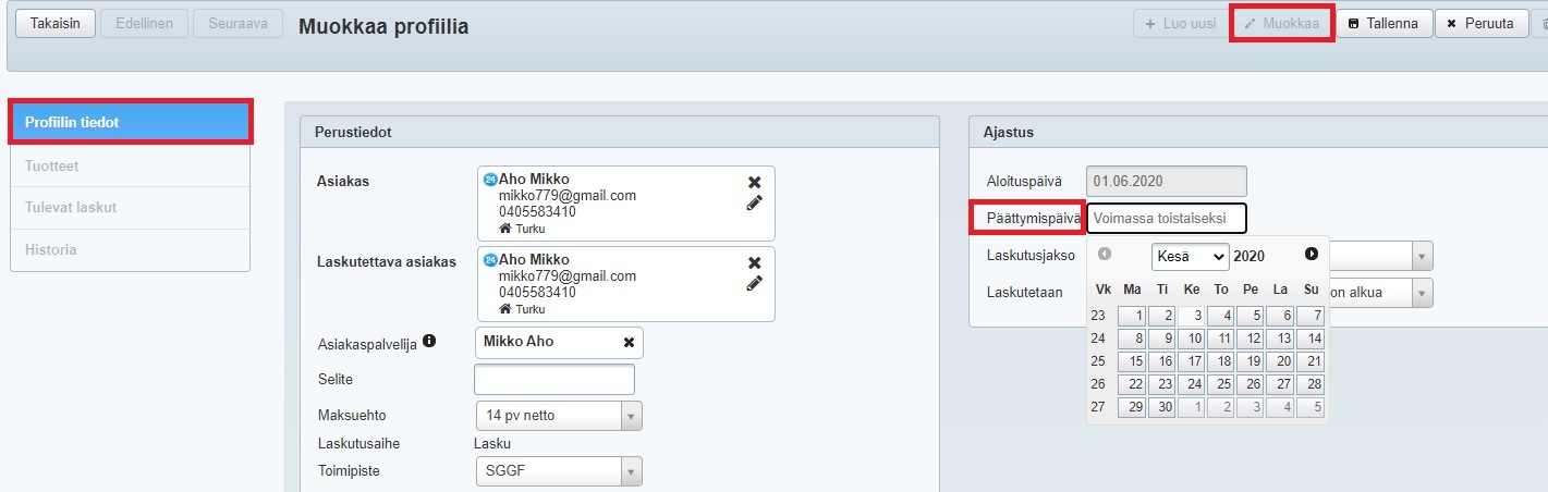 - Jos et aseta päättymispäivää, laskutusprofiili on voimassa toistaiseksi.