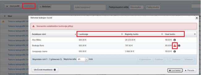 Kun luot laskuja ja luotavien laskujen joukossa on asiakkaita, joiden luottoraja ylittyy, Tehden näyttää heti Luo myynnit -painikkeen klikkaamisen jälkeen listauksen näistä asiakkaista. Näet asiakkaiden luottorajan, jo käytetyn luoton sekä tämän laskun muodostaman uuden luoton, ja voit tietojen perusteella päättää, luodaanko laskut vai ei. Jos asiakkaalle ei ole sallittu luottorajan ylittämistä, näet punaisen varoituskolmion, eikä asiakkaalle voida enää luoda uutta laskua. Voit myös ladata näiden asiakkaiden tiedot talteen Vie Excel-muodossa -painikkeesta: