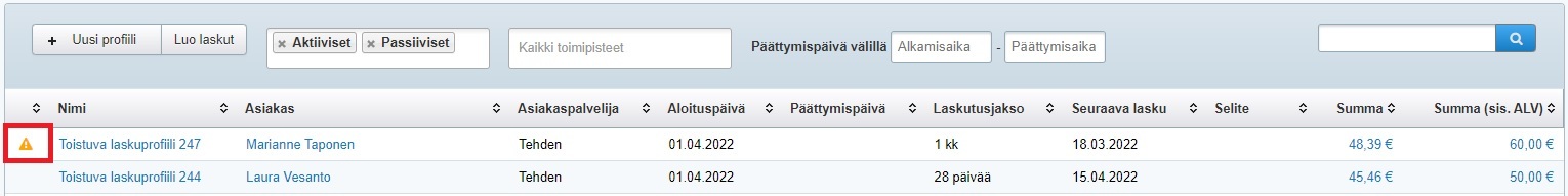 Jos olet ottanut käyttöön luottorajan, näet toistuvan laskutuksen laskutettavien profiilien listauksessa huutomerkin niiden laskujen kohdalla, jotka ylittävät luottorajan: