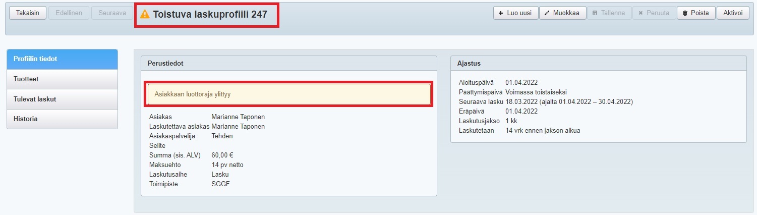 Luottorajan ylittämisestä varoitetaan myös toistuvalla laskuprofiililla, siellä jo siinä vaiheessa, kun seuraava muodostettava lasku on ylittämässä luottorajaa: