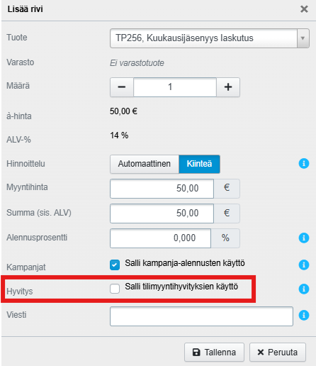 Toistuvan laskutuksen tuotteiden tilimyyntihyvityksen voi myös erikseen estää. Toistuvassa laskutuksessa tuotetta lisättäessä, muokattaessa ja tulevien laskutusjaksojen tuoterivejä muokattaessa on näkyvissä Salli tilimyyntihyvityksien käyttö -valinta. Kun kohtaa ei ole valittu, estetään mahdollinen hyvitys sellaisille tuotteille, joihin liikuntaetua ei saa käyttää. Tilimyyntihyvitys on oletuksena sallittu kaikille toistuville laskutusprofiileille ja niiden tuoteriveille.