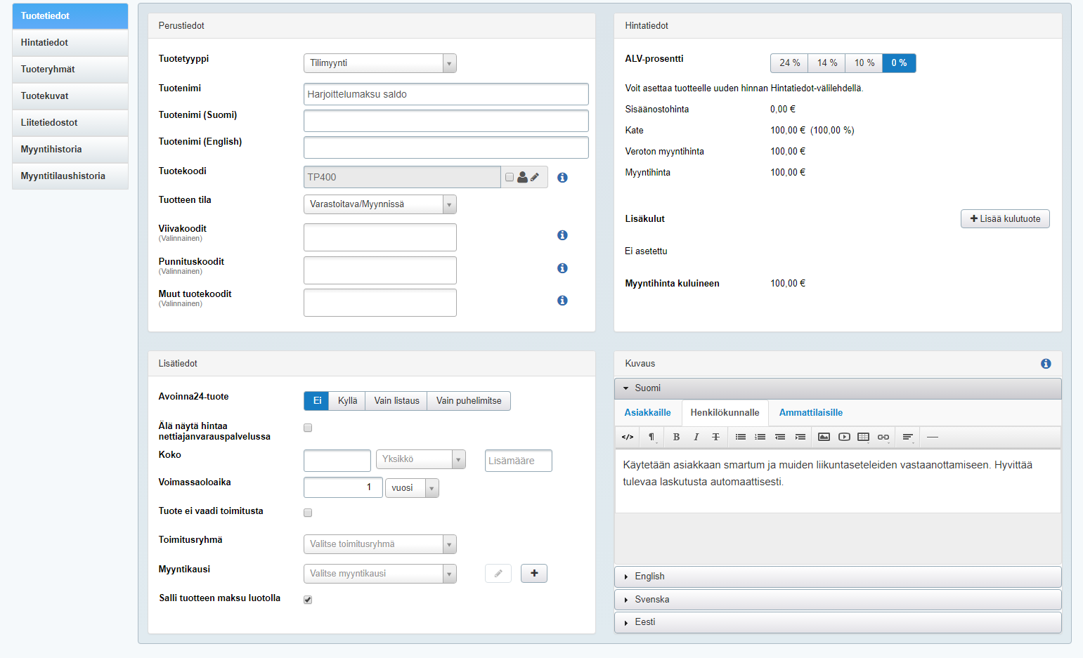 Nimeksi tilimyyntituotteelle voi antaa esimerkiksi Harjoittelumaksusaldo. Huom! Suosittelemme tekemään tuotteelle oman tuoteryhmän , sillä kirjanpitäjät toivovat usein, että saatuja ennakoita seurataan kirjanpidossa erillisellä kirjanpitotilillä. Kun tuote on lisätty omaan tuoteryhmäänsä, tuoteryhmän voi sitoa tilimyynnin seuraamista varten luotuun kirjanpitotiliin .