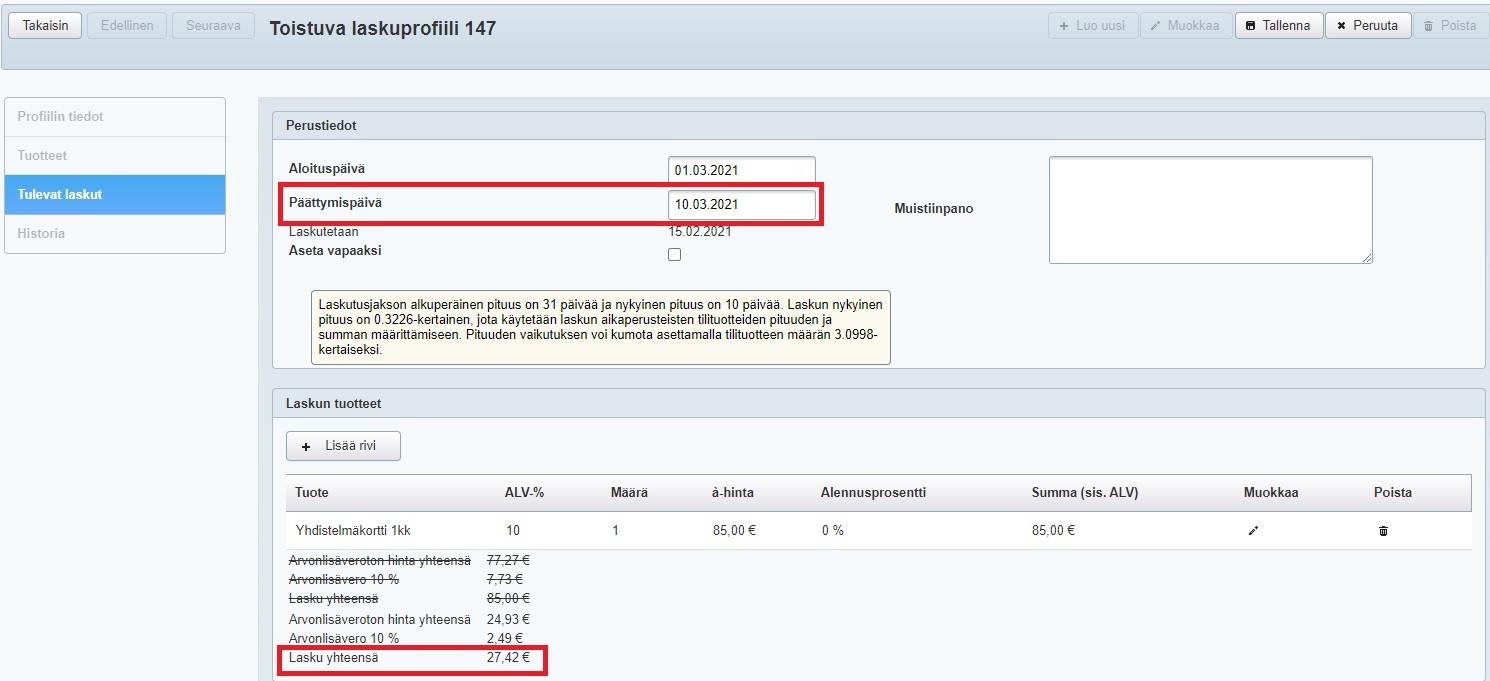 - Valitse seuraava lasku, klikkaa Muokkaa-painiketta ja muuta laskun päättymispäivää tarpeen mukaan, Jos asiakas esimerkiksi irtisanoo 10.2. ja irtisanomisaika on 1 kk, merkitse päättymispäiväksi 10.3. Tehden laskee automaattisesti laskulle uuden hinnan laskutuskauden pituuden mukaan: