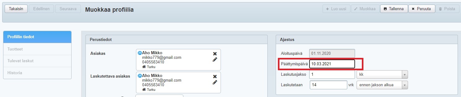 - Tallenna. Asiakas saa viimeisen laskunsa toistuvan laskutuksen kautta.