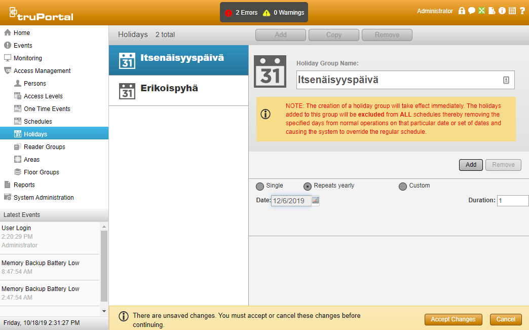 - Menkää kohtaan Access Management -> Holidays ja klikatkaa Add-painiketta ylälaidasta.