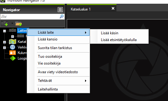 Kun laitteeseen on saatu onnistuneesti avattua yhteys, voit laajentaa puurakenteen tuplaklikkaamalla laitteen nimeä hiirellä. Laitteen alla näkyvät siihen kytketyt kamerat. Saat kameran kuvan valitulle katselualueelle tuplaklikkaamalla katselualueen nimeä.