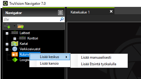 Klikkaa vasemman laidan palkissa olevaa ‘Kulunvalvonta’-kohtaa hiiren oikealla painikkeella ja valitse ‘Lisää keskus’.