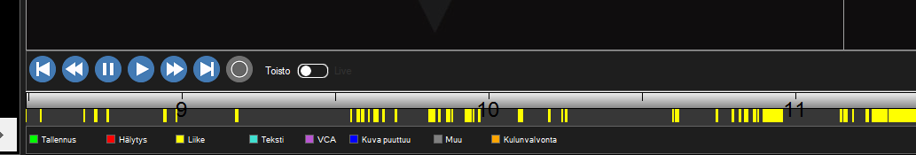 Kun haluat palauttaa videoikkunat live-tilaan, tämä tapahtuu toiston hallintanappien oikealla puolella olevasta Toisto/Live valitsimesta. Klikkaamalla tätä palautetaan katselu live-tilaan.