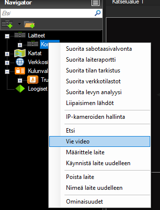 Voit halutessasi varmuuskopioida videot omalle kovalevylle tai esim. muistitikulle käyttämällä Navigatorin ‘Vie video’-ominaisuutta. Aloita videon vienti klikkaamalla haluttua videokeskusta hiiren oikealla napilla ja valitse ‘Vie video’. Aukeavassa ikkunassa voit valita tiedostosijainnin minne tallennus tehdään, mitkä kamerat sisällytetään vientiin sekä viennin alku- ja loppuajan. Voit halutessasi tehdä myös ajastetun viennin, joka mahdollistaa esim. aina keskiyöllä tehtävän kopioinnin. Huomioi, että videokuva vie huomattavasti tallennustilaa. Esimerkiksi 720p-tasoisen videon tallennus vie vuorokaudessa yli 20Gt tallennustilaa, olettaen että kamera tallentaa jatkuvasti.