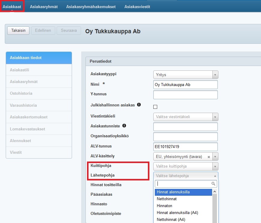 Ostolähetteiden tulostaminen ei ole kirjanpidon näkökulmasta pakollista, ja siksi Tehdenin oletusvalinta ostolähetteen käytössä on "Älä tulosta". - Jos haluat määritellä asiakkaalle kuitti- ja lähetepohjat, joita oletuksena asiakkaan kanssa käytetään, se onnistuu asikkaan asiakaskortilla: