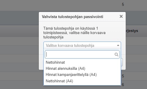 Jokaisesta tulostetyypistä yhden mallin on aina oltava aktiivisena, eli et voi passivoida esim. kaikkia lähetepohjia.