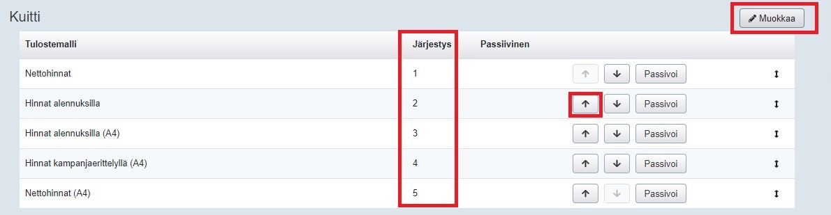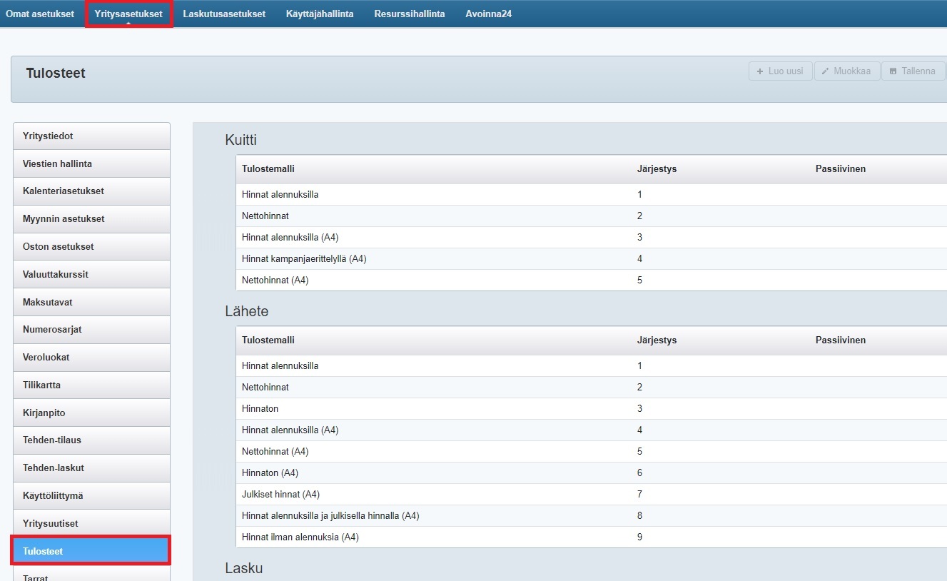 Tulosteet-välilehdellä voi ottaa osan tulostemalleista kokonaan pois käytöstä ja aktivoida ne myöhemmin uudelleen. Yrityksellä voi olla esimerkiksi lähetepohjista käytössä useita erilaisia malleja, ja voit muokata niiden näyttöjärjestystä Tulosteet-välilehdellä: