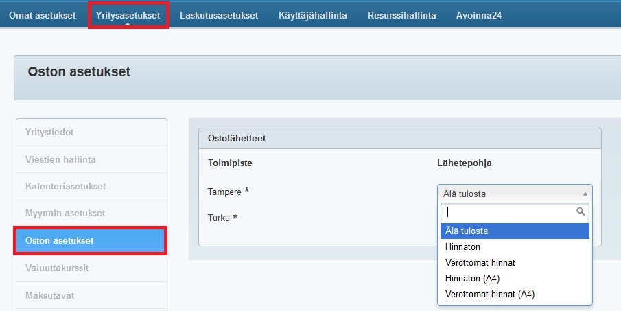 - Ostolähetteen toimipistekohtaisen oletuspohjavalinnan puolestaan pääset tekemään Yritysasetusten Oston asetuksissa: