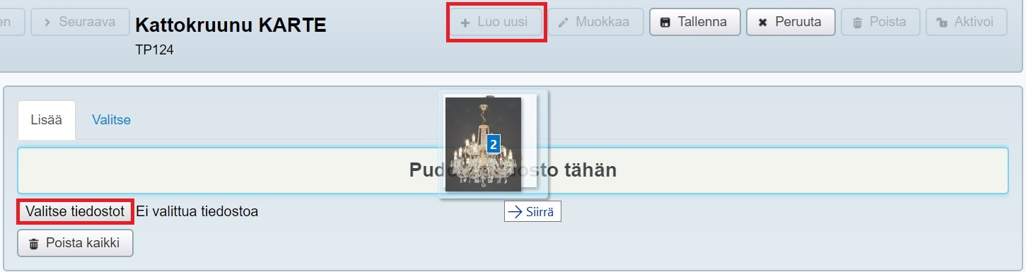 Tuotekuvan poistaminen tapahtuu Tuotekuvat-välilehdellä valitsemalla kuva ja klikkaamalla sen jälkeen Poista-painiketta. Tuotekuvan poistaminen Tiedostot-osiosta, poistaa kuvan myös tuotetiedoista.