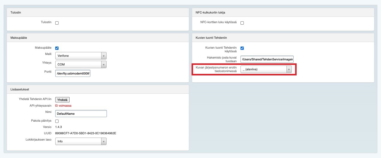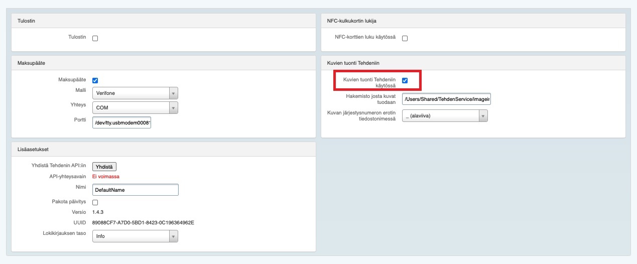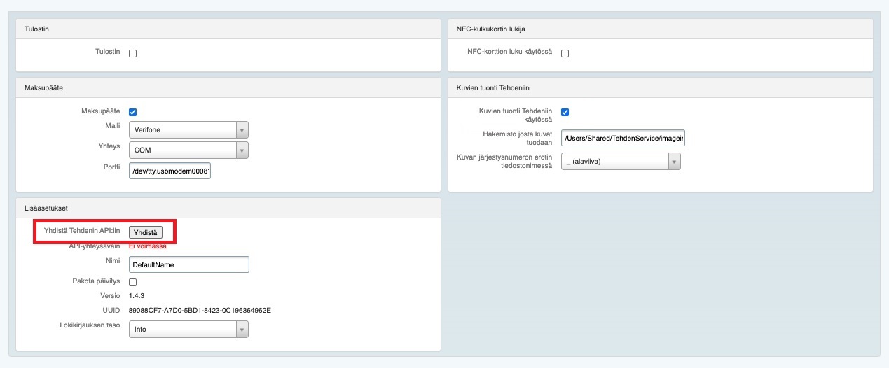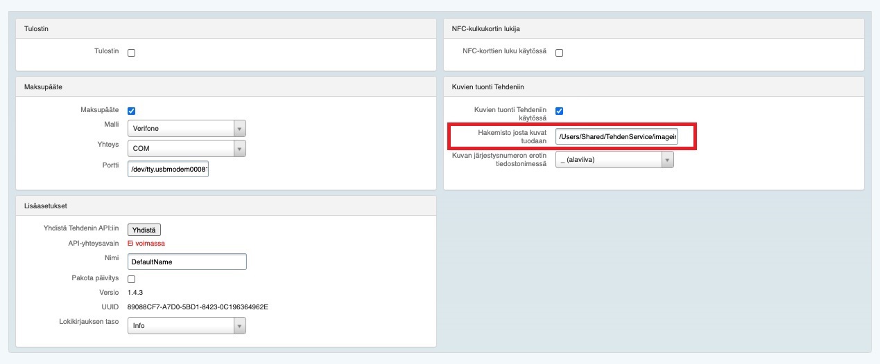 Hyväksy yhdistäminen aukeavassa ikkunassa. Tämän jälkeen aukeaa onnistuneesta yhdistämisestä ilmoittava ikkuna. Jos yrityksessäsi on aiemmin ollut käytössä esimerkiksi NFC-lukija, API-yhteys saattaa olla jo muodostettu ja tämän kohdan voi ohittaa. - TehdenHub luo määrittelemääsi sijaintiin kansion siirrettäviä kuvia varten. Oletuksena kuvakansio sijaitsee tietokoneen Jaettu-kansiossa, ja sen polku on Windows-ympäristössä C:\Users\public\TehdenService\imageimport\. Mac-ympäristössä polku on "/Users/Shared/TehdenService/imageimport"