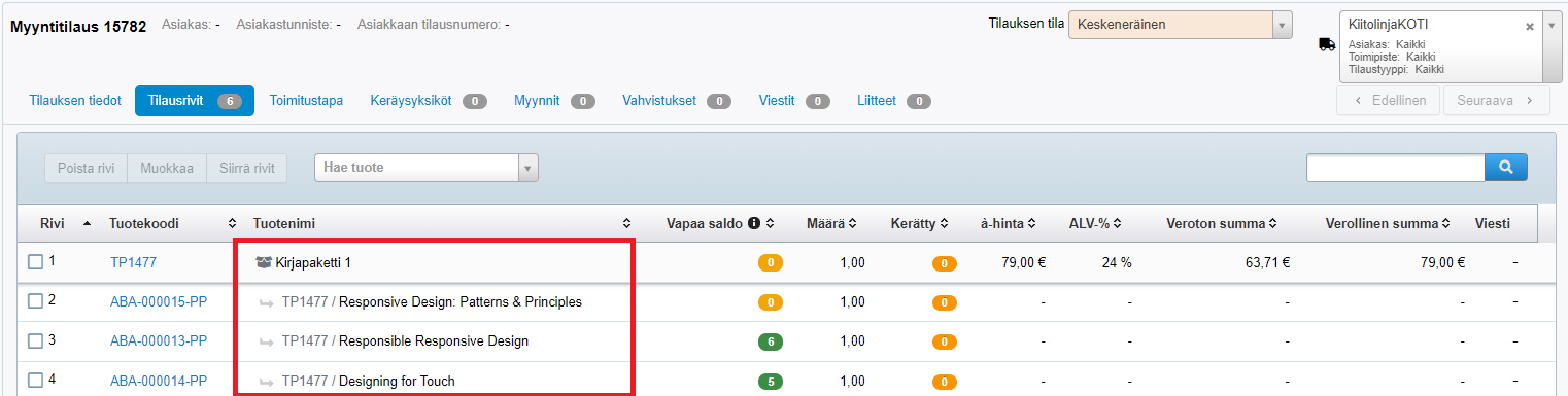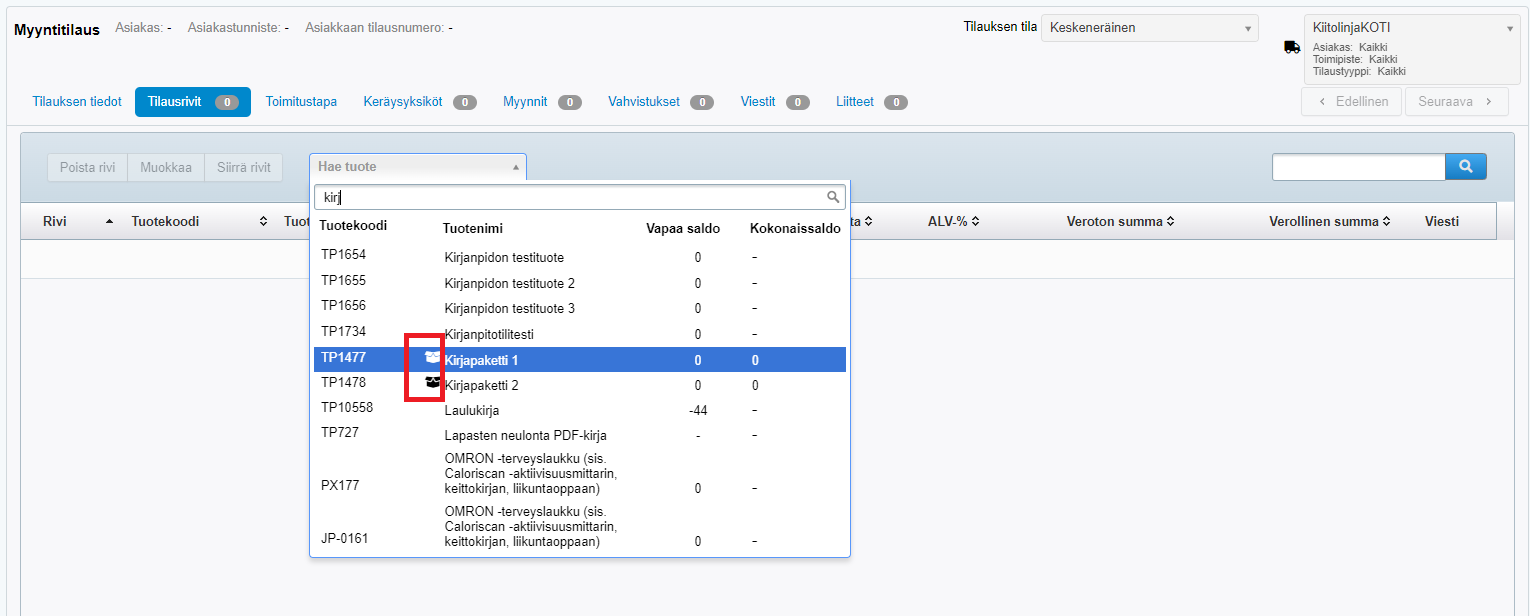 - Tilausrivit-välilehdellä näet sekä erillisen, pakettikuvakkeesta tunnistettavan tuotepaketti-tuotteen että kaikki tuotepaketin sisältämät tuotteet omilla riveillään: