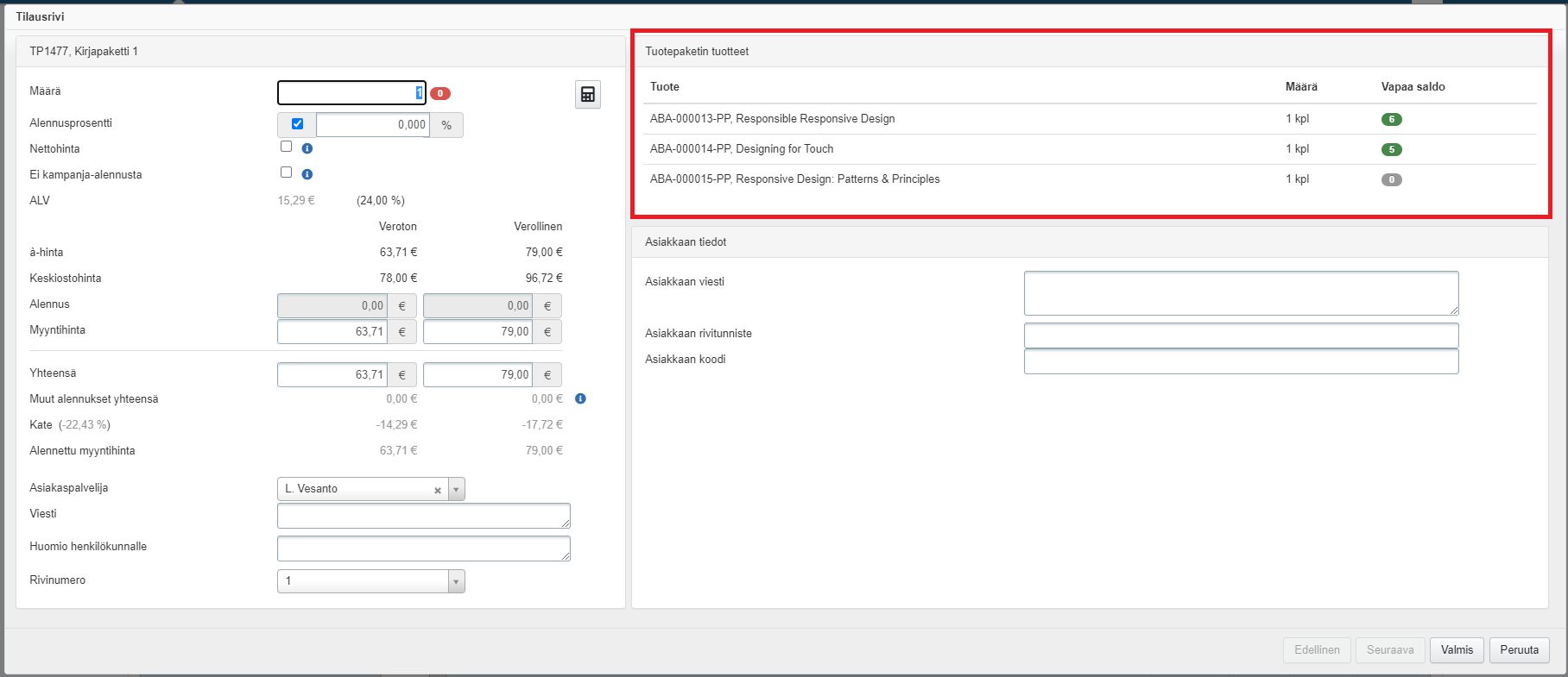 - Kun valitset tuotepaketin, näet paketin tuotteet ja niiden saldotiedot omassa osiossaan. Tuotepaketin sisältöä ei voi muokata tai paketin tuotteita poistaa myyntitilauksella: