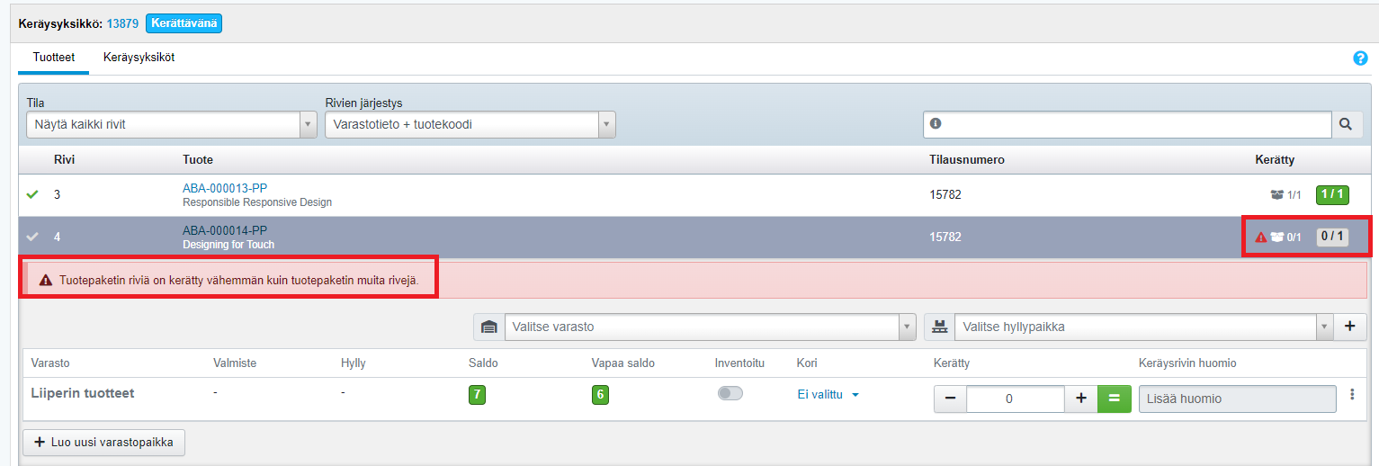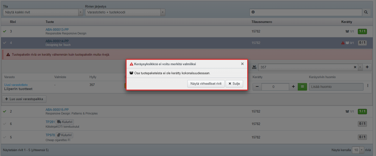 - Jos varoituksesta huolimatta yrität merkitä keräyksen valmiiksi, Tehden estää sen. Näytä virheelliset rivit -painiketta klikkaamalla näet ne tuotteet, joita on keräilty vähemmän kuin muita tuotepakettiin kuuluvia tuotteita: