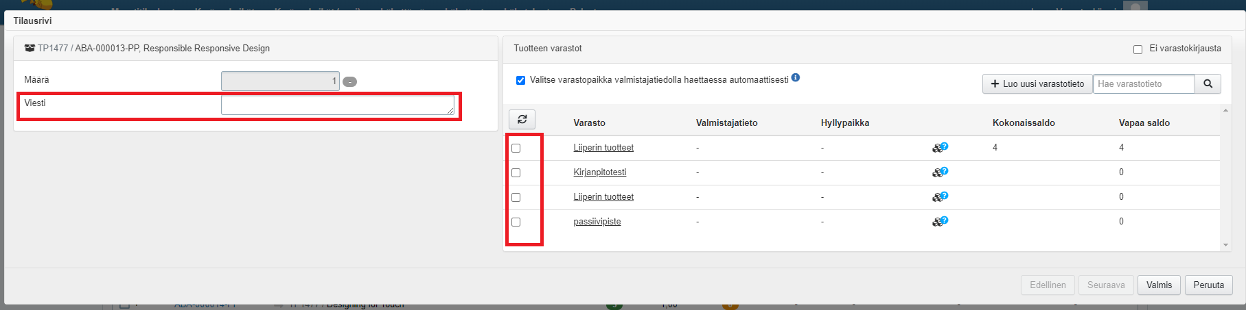 - Jos haluat lisätä yksittäisen tuotepaketin tuotteen riville viestin tai valita, mistä varastosta tuote keräillään, voit kaksoisnapsauttaa tuotepaketin tuotteen riviä, jolloin pääset yksittäisen tuoterivin hallintaan: