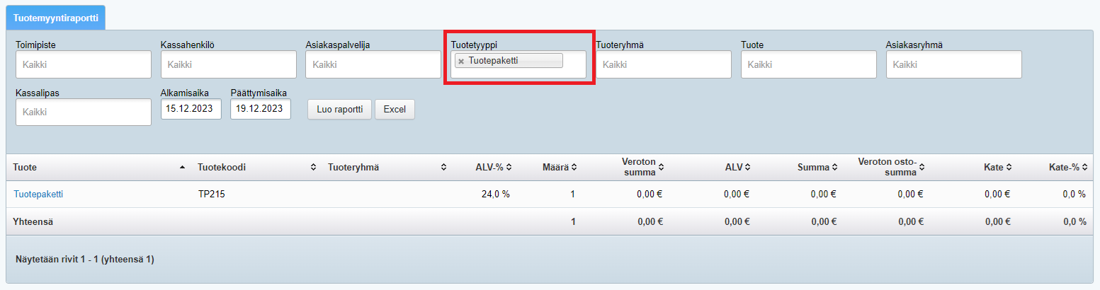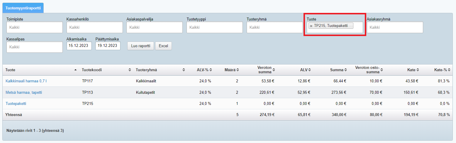 Myyntiraportilla voi seurata vain tuotepaketin sisältävien tuotteiden myyntiä, eli ei koko tuotepaketin myyntiä. Jos haluat tietoa myytyjen tuotepakettien kappale- tai euromääristä, voi siihen käyttää tuotemyyntiraporttia.