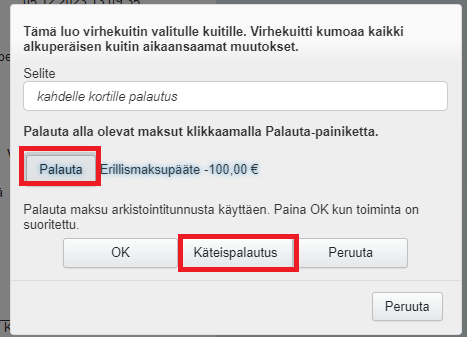 - Huom! Jos palautus tehdään prosentteina (esim. 50 %), ja myöhemmin halutaan hyvittää vielä lisää (esim. loput 50 %), toista palautusta ei pysty tekemään alkuperäiselle kuitille. Tällaisessa tapauksessa tee ensin virhekuitti ensimmäisestä osapalautuksesta ja kirjaa sitten palautus koko halutulta prosenttiosuudelta alkuperäiselle kuitille.