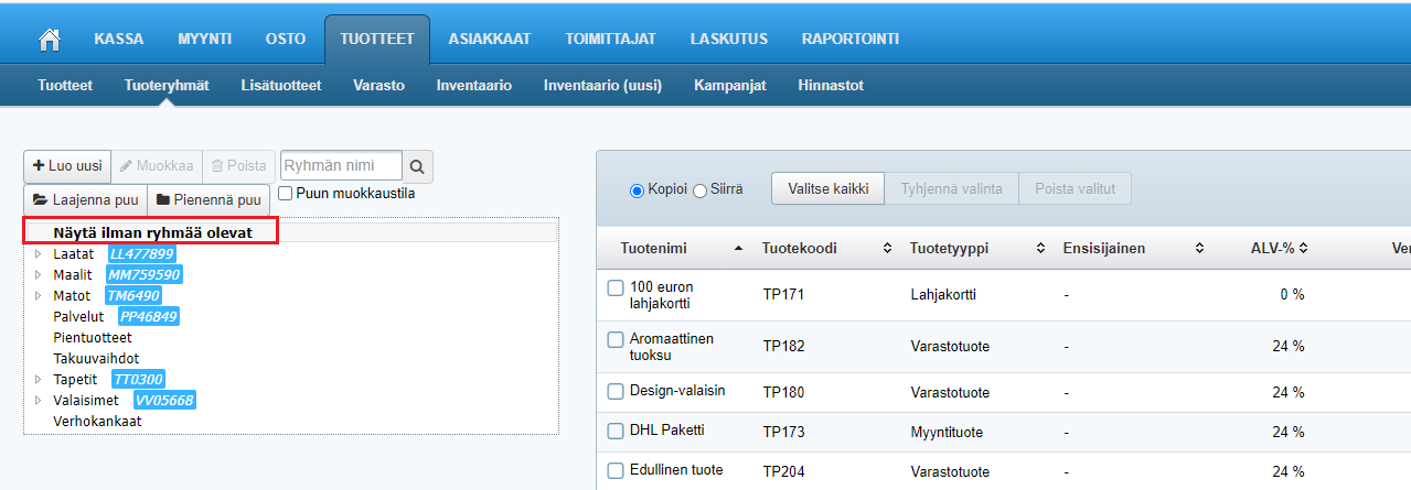 Tuoteryhmät-sivun pääikkuna jakaantuu kahteen osaan, joista vasemmanpuoleisessa puunäkymässä ovat tuoteryhmät ja oikeanpuoleisessa taulukkonäkymässä on luettelo tuoteryhmäpuussa kullakin hetkellä valittuna olevan ryhmän sisältämistä tuotteista. Näytä ilman ryhmää olevat -valintaa klikkaamalla näet tuotteet, jotka eivät kuulu mihinkään tuoteryhmään: