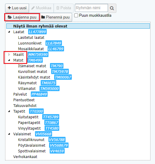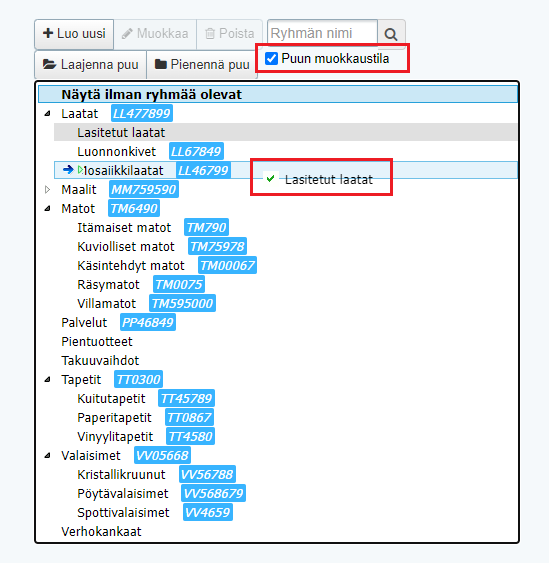 Voit muuttaa tuoteryhmien järjestystä puussa raahaamalla ryhmiä hiirellä. Rastita ensin Puun muokkaustila päälle. Huom! Tuoteryhmät ovat puussa aina aakkosjärjestyksessä, eli raahaamalla niitä voi siirtää vain toisten tuoteryhmien aliryhmiksi tai aliryhmästä ylätasolle.