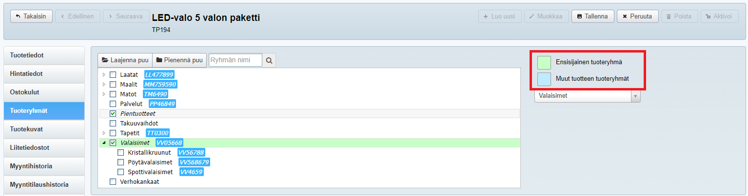 Koska tämä on valittujen tuotteiden ainoa tuoteryhmä, siitä tulee automaattisesti ensisijainen tuoteryhmä, jota käytetään esim. myyntiraporteilla.