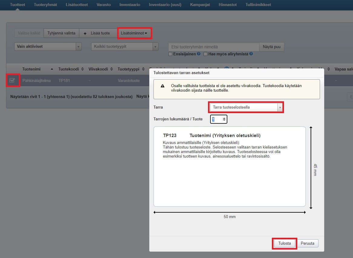 - Valitse tuotetaulukosta ne rivit, joille haluat tulostaa tarrat. Mikäli jollakin valitulla tuotteella ei ole viivakoodia, Tehden luo viivakoodin tuotteen tuotekoodin perusteella.