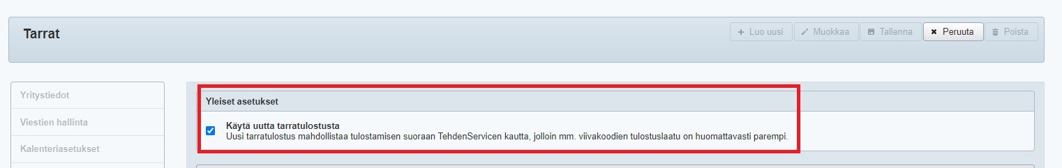 Suosittelemme ottamaan käyttöön uuden tarratulostuksen, jossa esimerkiksi viivakoodien tulostusjälki on huomattavasti entistä parempi. Uusi tarratulostus otetaan käyttöön Yritysasetusten Tarrat-välilehdellä: