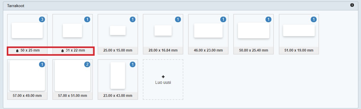 - Jos haluat luoda uuden tarrakoon, klikkaa Tarrakoot-osion Luo uusi -painiketta ja määrittele tarran mitat. Luo tänne ainakin kaikkien käyttämiesi tarratulostinten tarrarullan tarrojen mukaiset koot. Tuotetarroja voi tulostaa myös selaimen kautta tavallisella tulostimella, eli jos haluat esimerkiksi tulostaa isompia tuoteselosteita tavalliselle paperille, voit määritellä myös näille sopivan koon.