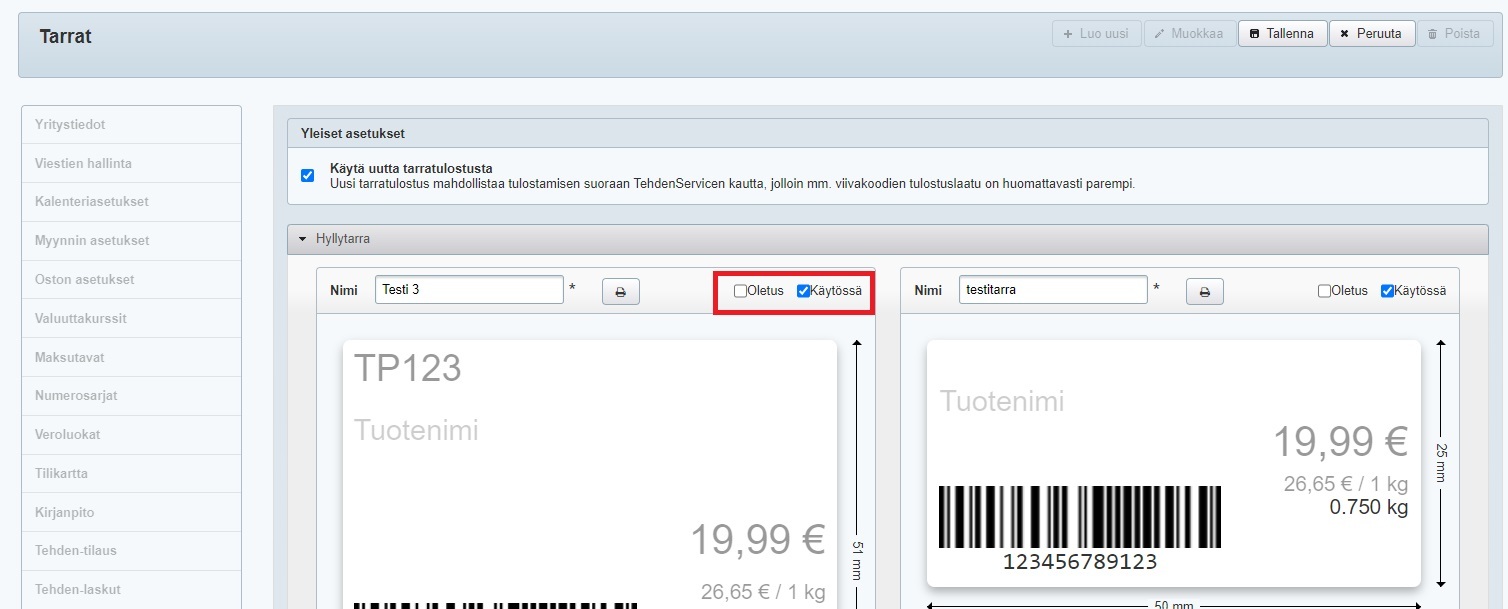 Tuotetarran koko ja sisältö määritetään pääkäyttäjän oikeuksilla yritysasetuksissa. Tarrapohjia voi olla useita erilaisia.
