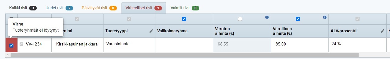 - Korjaa virheelliset tai puuttuvat rivit. Kokonaisen sarakkeen virheelliset tai puuttuvat tiedot pystyy korjaamaan kaikki kerrallaan klikkaamalla kyseisen tuotteen otsikon oikealla puolella olevaa kynän kuvaa.
