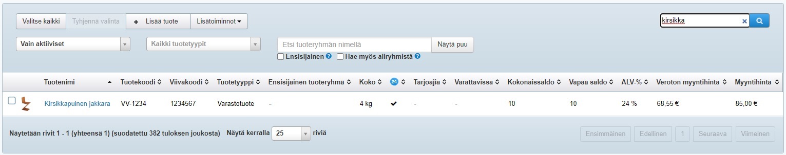 Onnistuneen tuotetietojen tuonnin jälkeen sinulla on Tehdenin Tuotteet-ohjelmassa tuotteita, joiden tuotelistauksessa näkyvät esimerkiksi tällaiset tiedot:
